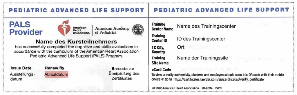 ⚠️ Wichtiger Hinweis: Eine Teilnahme am AHA-PALS-Refresher-Kurs ist nur bei Vorliegen einer nicht abgelaufenen AHA-PALS-Provider Card möglich: